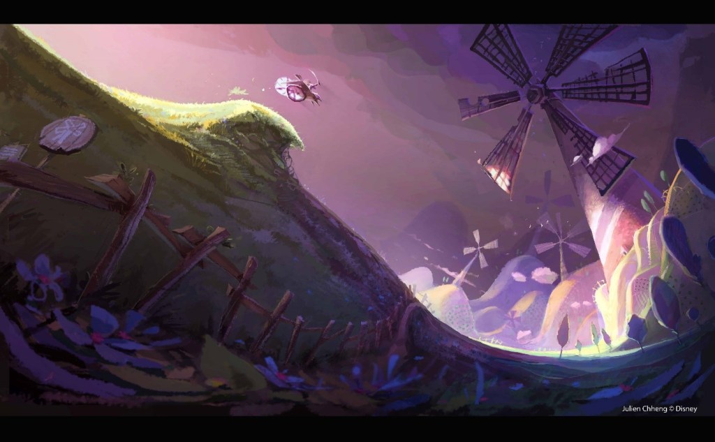 Juste à la sortie des Gobelins, mon premier emploi était animateur de personnages sur un film fait en dessin traditionnel sur papier, Titeuf, basé sur la bd. Puis j’ai été recruté pour un « training » en développement visuel aux studios Disney à Burbank aux Etats-Unis. C’était un rêve d’étudiant d’aller travailler dans ce studio mythique. J’y ai côtoyé des artistes que tous les étudiants d’animation admiraient, c’était fou. Pendant ces mois de training en développement visuel, qui servent à nous rendre suffisamment aguerris pour intégrer les équipes qui travaillent sur les films en cours, j’ai travaillé d’abord sur un exercice d’adaptation libre autour de l’histoire de Don Quichotte. Puis très vite, j’ai dessiné des personnages pour le film Les mondes de Ralph, qui était le film en cours de production.