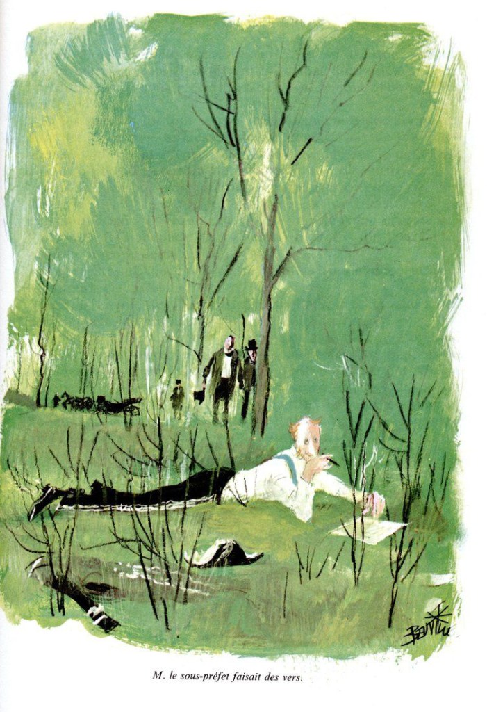 Lorsqu’on est gamin, on est plus facilement attiré par les dessins appliqués de Jeanne Hives, qui illustrait Fantômette. On a besoin de ressentir le travail, l’application. Alors que Beuville amenait cette espèce de vivacité, mais aussi des cadrages très étranges, qui utilisent à la fois la profondeur et la surface. Il alternait aussi dans ses images l’aspect narratif et l’aspect contemplatif. Souvent, un illustrateur penchera plutôt pour l’un ou l’autre de ces aspects. Alors que lui, dans un même ouvrage, va choisir parfois le sol, parfois le ciel : quand il choisit le sol, c’est un espace à appréhender, et quand il choisit le ciel, c’est de la contemplation. Je pense notamment à une illustration des Lettres de mon moulin d’Alphonse Daudet, avec un personnage allongé au sol, une fleur entre les lèvres, regardant la forêt qui lui bouche l’horizon. Beuville travaille sur un espace, plutôt que sur une information. Il n’a sans doute pas été sans connaître le travail de Gus Bofa qui avait le même souci du cadre.
