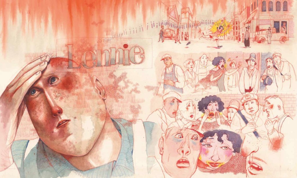 A : Oui tout à fait. Ce sont des double-pages en permanence ou parfois des pages simples côte à côte, et le texte est intégré à l’image. On se rapproche vraiment de la bande dessinée. Elle souhaitait s’essayer à une approche nouvelle. À partir de là, l’ampleur du travail était colossale. Elle a vite compris qu’elle ne pouvait pas travailler de la même manière que sur ses autres livres. D’habitude, minutieuse comme elle est, elle fait beaucoup de croquis préparatoires, esquisse ensuite chaque personnage isolément pour pousser au bout le travail du dessin, puis réaliser un crayonné global de la scène avant de repartir de zéro, sur un autre papier, pour poser le travail à la gouache. C’est très léché. Or lorsqu’il s’agit, pour Des souris et des hommes, de réaliser 420 pages illustrées, il était humainement impossible de travailler de cette manière. Elle s’est donc réinventée dans sa technique après plus de vingt ans de carrière, en partant directement de sa planche finale, au crayon, aux crayons de couleurs, à la gouache, en faisant remonter son dessin par couches. Si quelque chose ne va pas, elle recouvrait d’une nouvelle couche. Le résultat est plus lâché, plus nerveux dans le dessin, plus brut, ce qui correspond parfaitement avec l’ambiance rugueuse qu’il y a dans Des souris et des hommes.