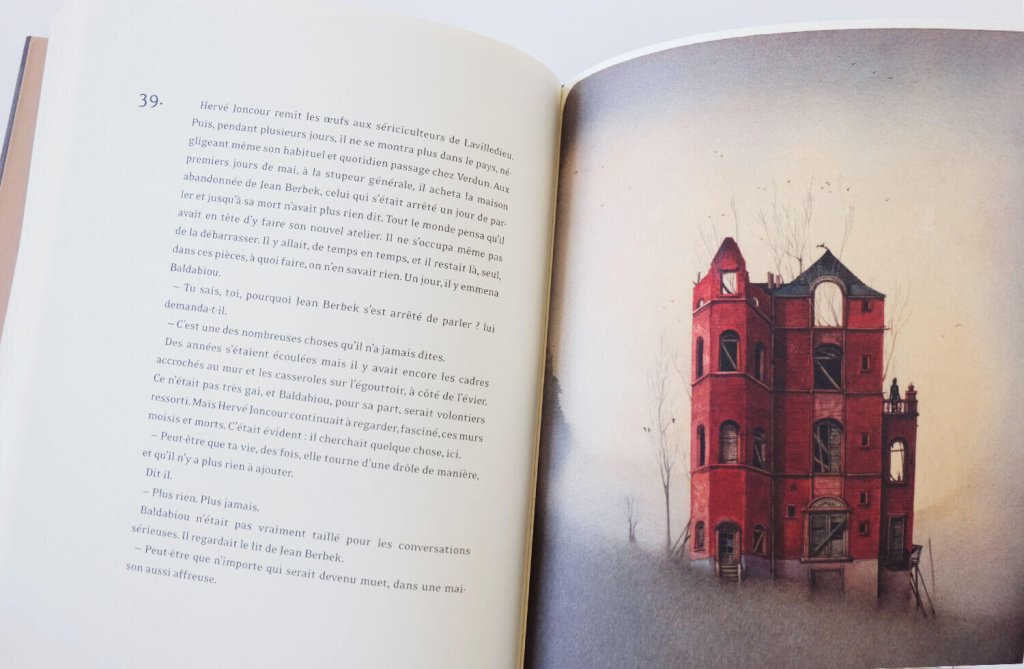 A : Si on prend Soie et Le soleil des Scorta (Des souris et des hommes a été conçu différemment), c’est-à-dire avoir une littérature illustrée, un texte intégral et autant de pages d’images que de texte tout en gardant l’espace de chacun, ce n’est vraiment pas fréquent. On trouve plutôt soit de la BD, du roman graphique, avec donc interpénétration du texte et de l’image, soit des éditions essentiellement romanesques, mais « enluminée », avec quelques images, mais pas le degré d’illustration que nos livres proposent.
