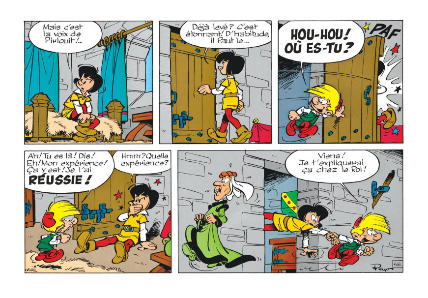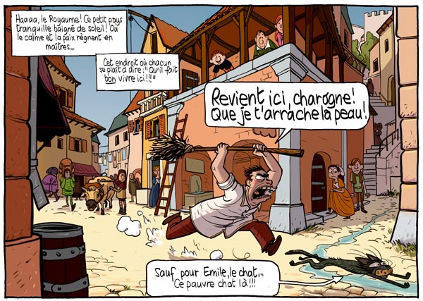 Oui, je travaille comme ça dès le début. Je fais un séquencier qui liste les scènes. Ce n’est pas très pratique, parce que lorsqu’une scène ne fonctionne pas, tout est déséquilibré. Les grandes lignes du récit sont généralement assez simples : je me fais des notes qui me le rappellent : « Simplifie ! Simplifie ! ». Je préfère complexifier à l’intérieur : dans les mises en scènes, les expressions, la drôlerie. Comme j’ai une formation de storyboarder, je sais m’amuser longtemps à l’intérieur d’une scène. Ça commence dans la taverne, puis les oiseaux s’en mêlent et les couches s’entrecroisent indéfiniment. J’essaye de faire en sorte que le récit reste organique et qu’il y ait un effet tourneur de page. Ce qui fait dire à certains lecteurs mécontents que mes bandes dessinées se lisent trop vite. Mais je suis attaché à cette fluidité.